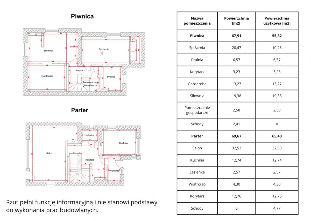 - Piwnica - 55,32 m2, parter - 65,40 m2, piętro - 46,58 m2, poddasze - 8,15 m2 pow. użytkowej