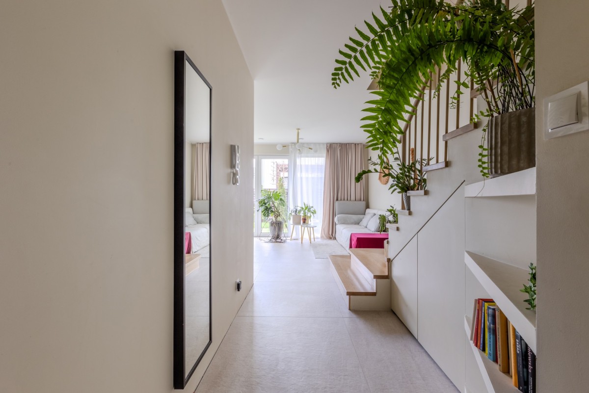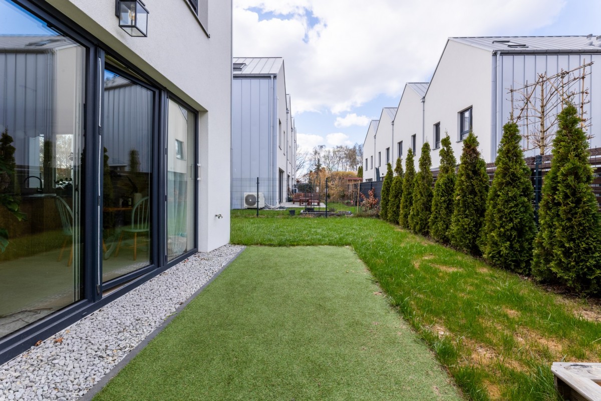 Do dyspozycji jest prywatny ogród o powierzchni 96 m², podzielony na część zieloną oraz miejsce postojowe obok domu.