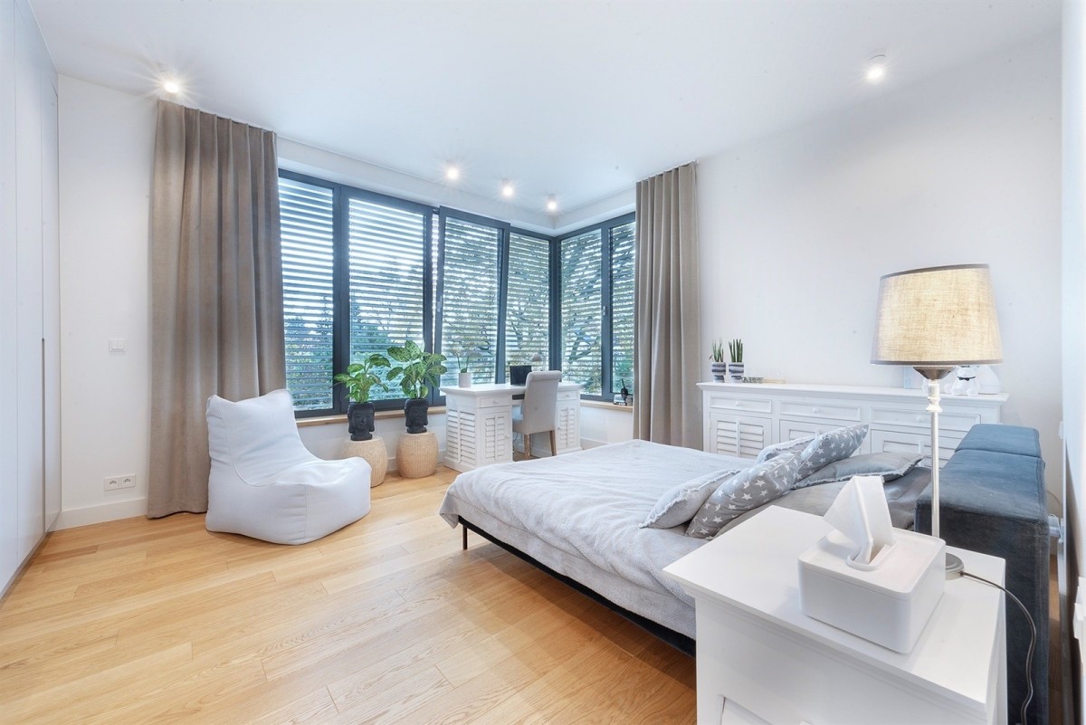 Układ pokoi bardzo funkcjonalny i elastyczny z możliwością zaaranżowania 5 sypialni oraz wygospodarowania dodatkowego gabinetu do pracy zdalnej. Aranżacja typowa dla nowoczesnych rozwiązań architektonicznych: