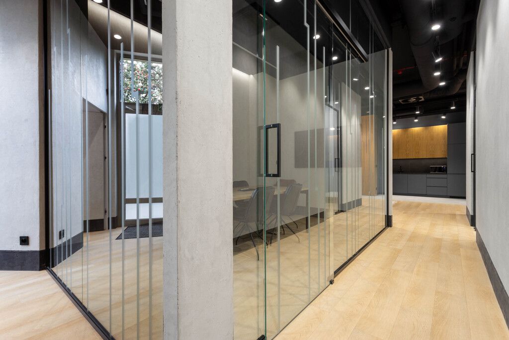 - glass-enclosed conference room with TV,