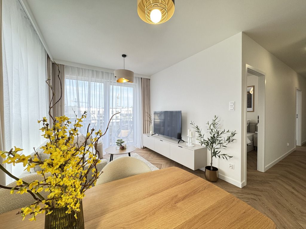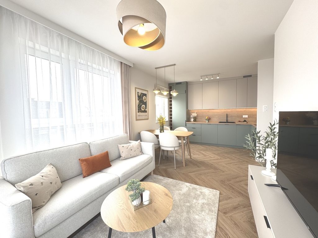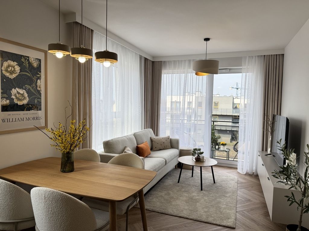 Salon z aneksem kuchennym to serce mieszkania – jasny, harmonijny, otwarty na światło i balkon.