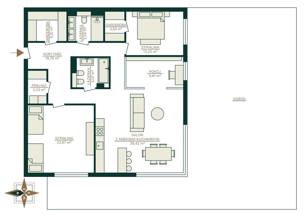 • Okna o wysokości 240 cm oraz wyjście do ogrodu z każdego pokoju