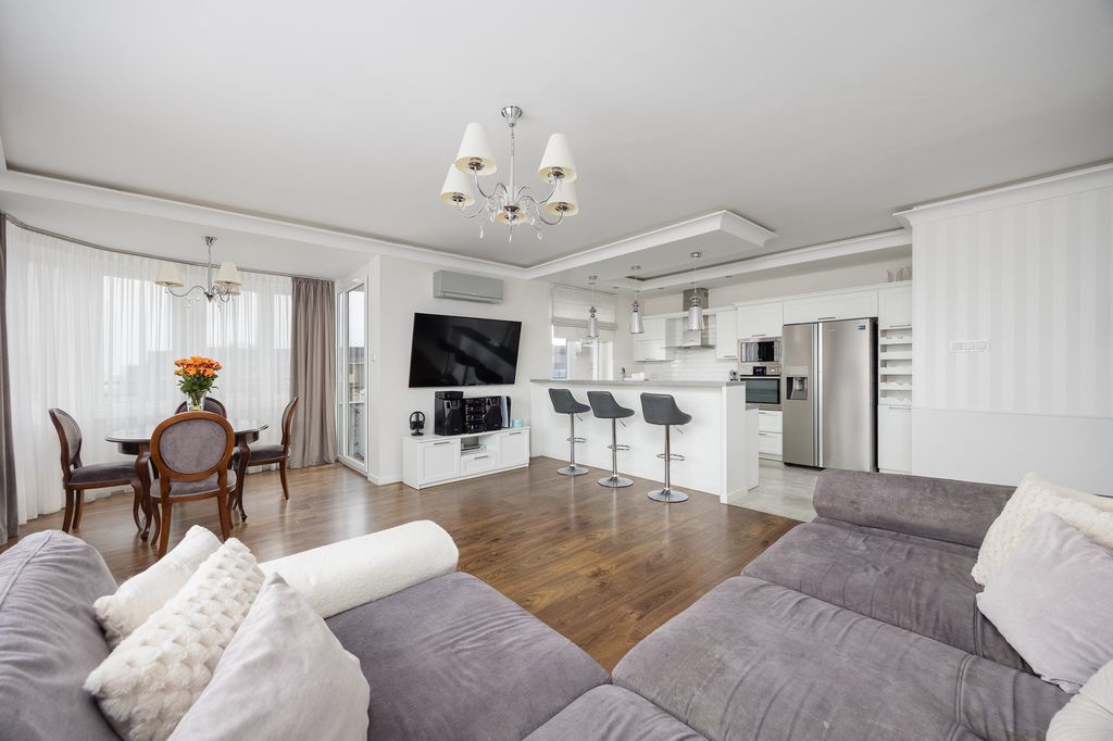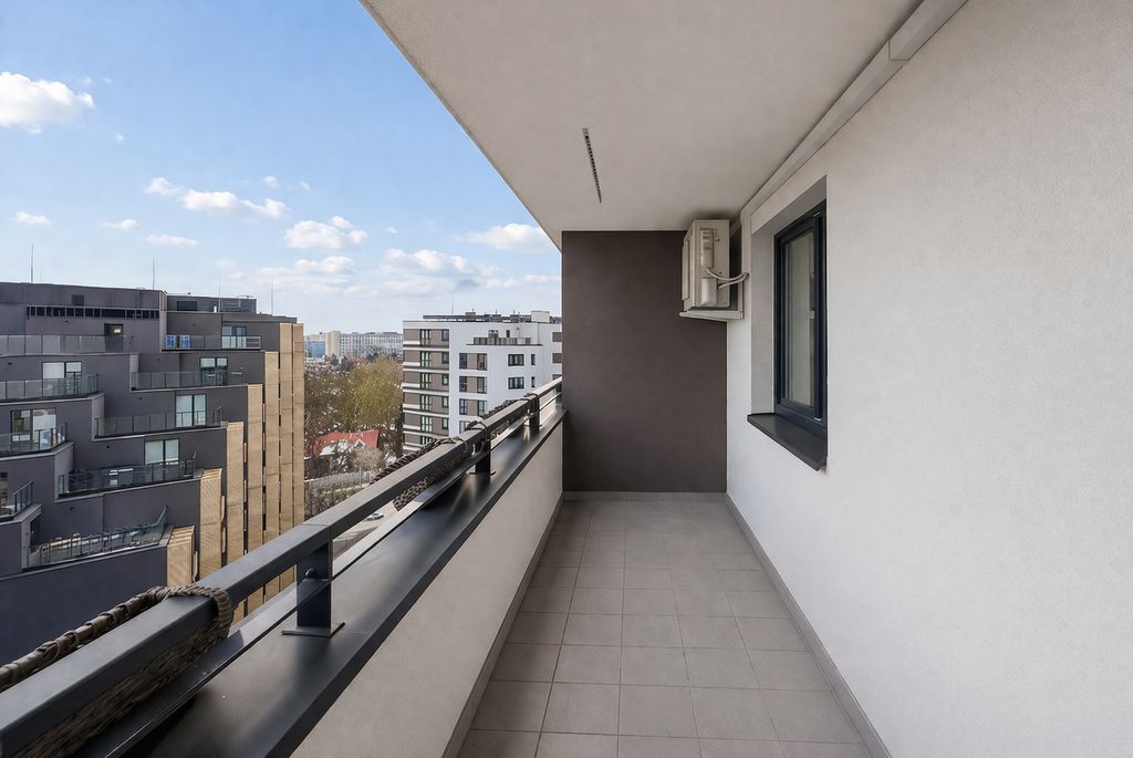 Lokal znajduje się na dziesiątym, ostatnim piętrze budynku, co zapewnia prywatność oraz brak sąsiadów nad głową. Ekspozycja na trzy strony świata sprawia, że mieszkanie jest jasne przez cały dzień, a wysokość pomieszczeń 270 cm dodatkowo potęguje poczucie przestrzeni. Komfort użytkowania podnosi klimatyzacja zainstalowana w salonie. Nieruchomość znajduje od cichej, wewnętrznej strony budynku z pięknym widokiem na tereny zielone.