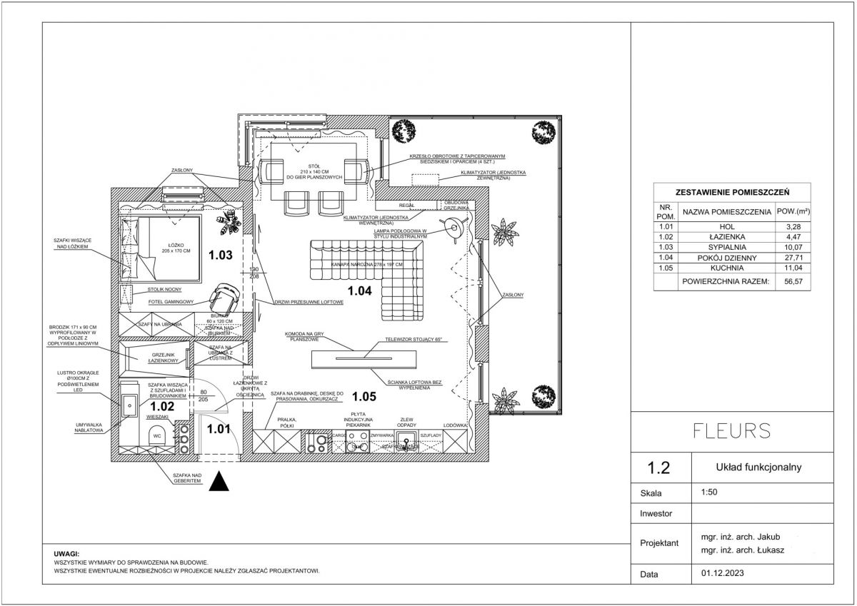 Przestrzeń zaprojektowana przez architekta wnętrz, łącząca efektowny design z wysoką funkcjonalnością. Przemyślany, zmieniony układ wnętrza tworzy otwartą strefę salonu, jadalni i kuchni, a jednocześnie pozwala zachować wygodną, prywatną sypialnię.