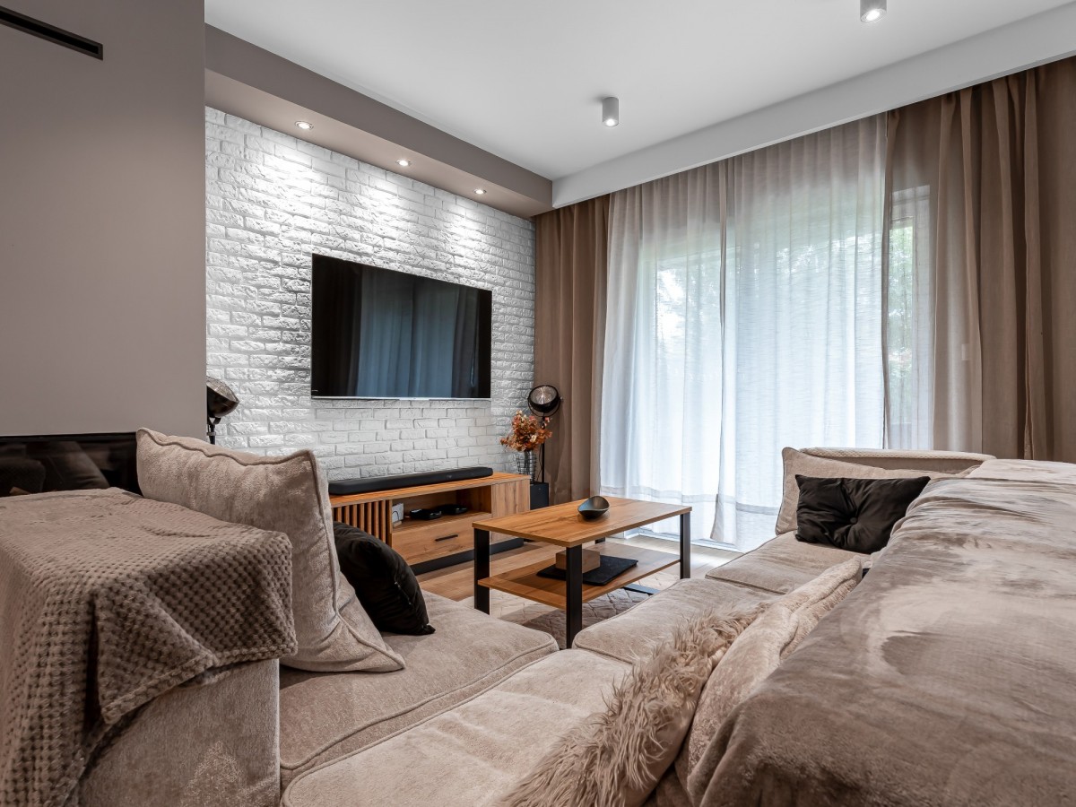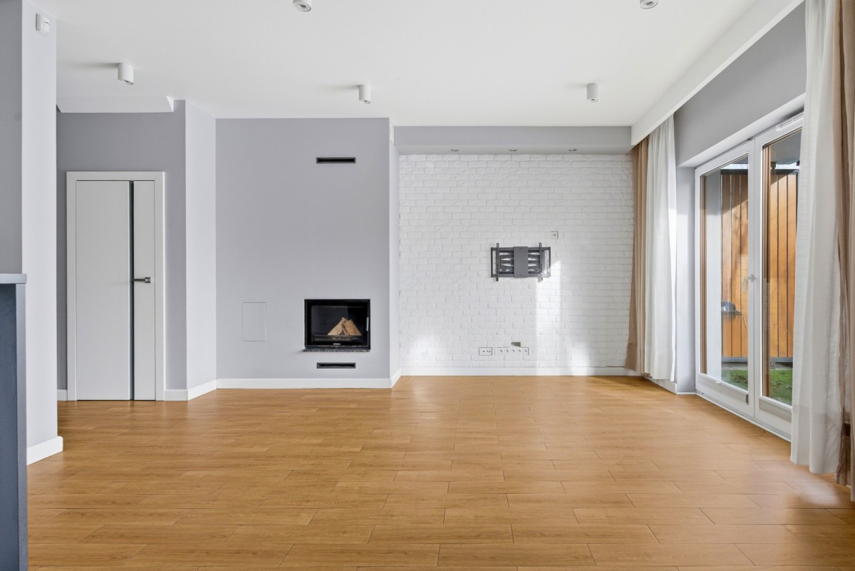 - salon z kominkiem i wyjściem do prywatnego ogródka - idealne miejsce na kawę czy spotkania z bliskimi
