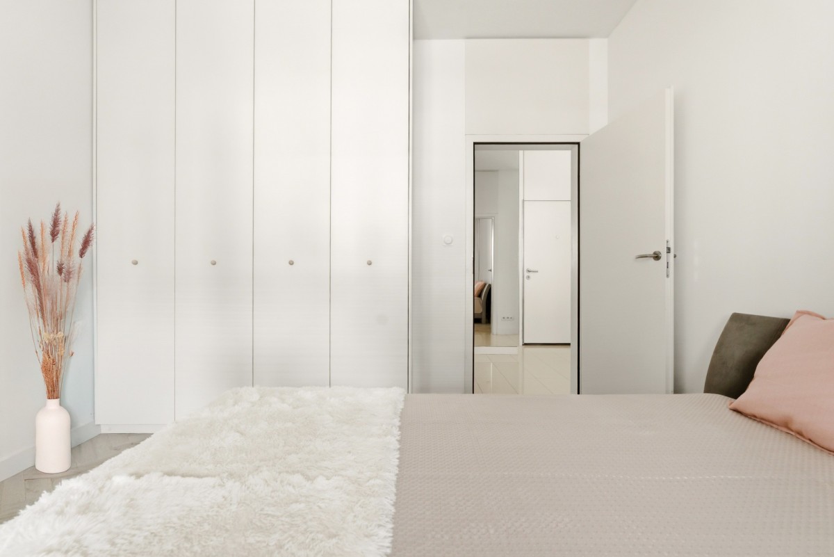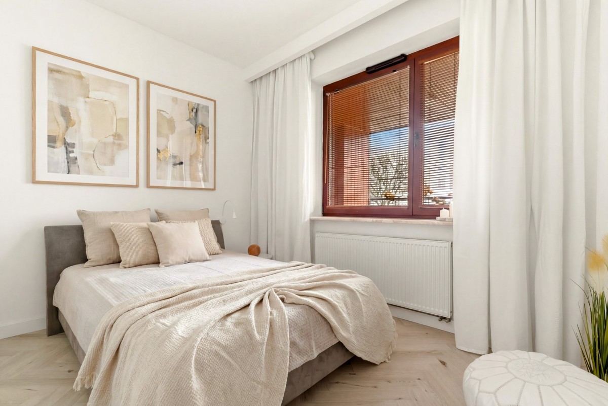 * Elegancka sypialnia wykończona z dbałością o detale, z dużym, wygodnym łóżkiem oraz pojemną szafą,