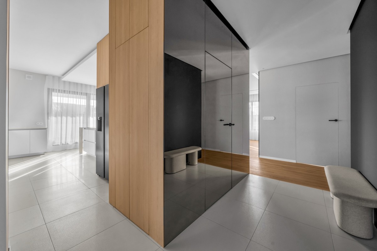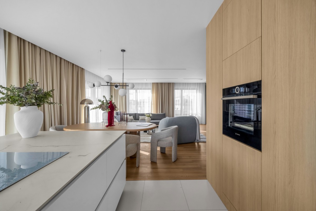 W kuchni zastosowano spieki kwarcowe, wysokiej klasy sprzęt AGD oraz zabudowę wykonaną na zamówienie. Na podłogach drewno naturalne. Apartament jest wyposażony w klimatyzację centralną.