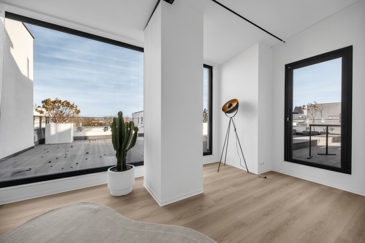 Taras otacza część dzienną, kuchnię oraz gabinet oferując wyjątkową przestrzeń do relaksu i spotkań towarzyskich, z możliwością stworzenia prywatnego ogrodu w sercu miasta.