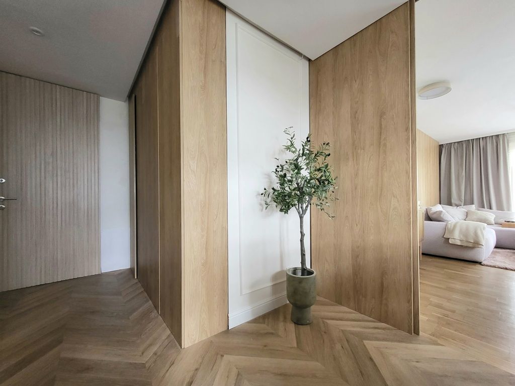 Niestandardowym rozwiązaniem jest przesuwna ściana z płyt drewnianych oddzielająca salon od kuchni.