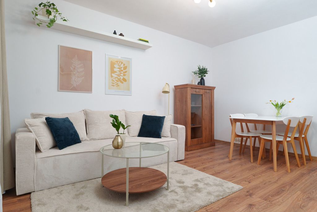 Salon (17,20 m²) urządzono w spokojnych kolorach, z wygodną sofą, stołem i miejscem do codziennych posiłków. To taka część mieszkania, w której od razu robi się przyjemnie — nic nie przytłacza i nic nie rozprasza. Z salonu wychodzi się na balkon (5,85 m²), a z niego można zejść prosto do ogrodu. Z ogrodu korzystają tylko mieszkańcy tego mieszkania, więc daje to poczucie prywatności i dodatkową przestrzeń na lato.