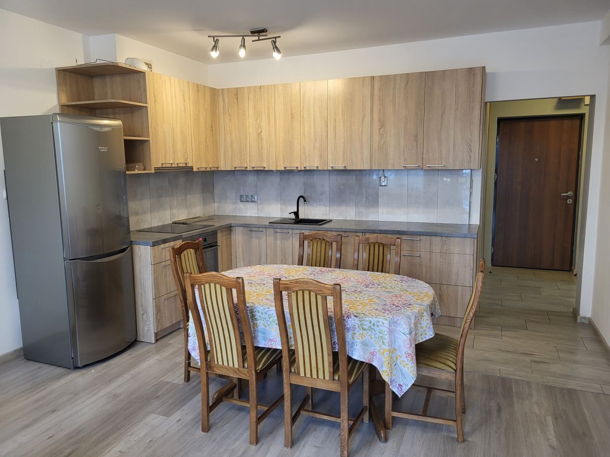 Mieszkanie wyposażone w niezbędne meble, zabudowa kuchenna z lodówką , piekarnikiem i zmywarką.