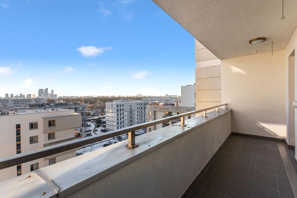 Samo mieszkanie zlokalizowane na 8. piętrze urzeka pięknym widokiem na wieżowce centrum Warszawy. Taras jest duży i mieści wygodne tarasowe meble.