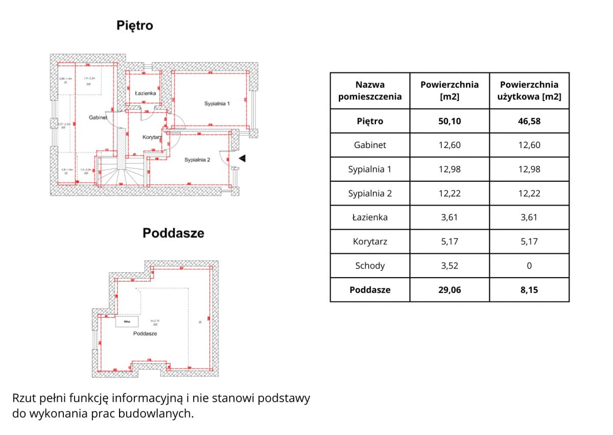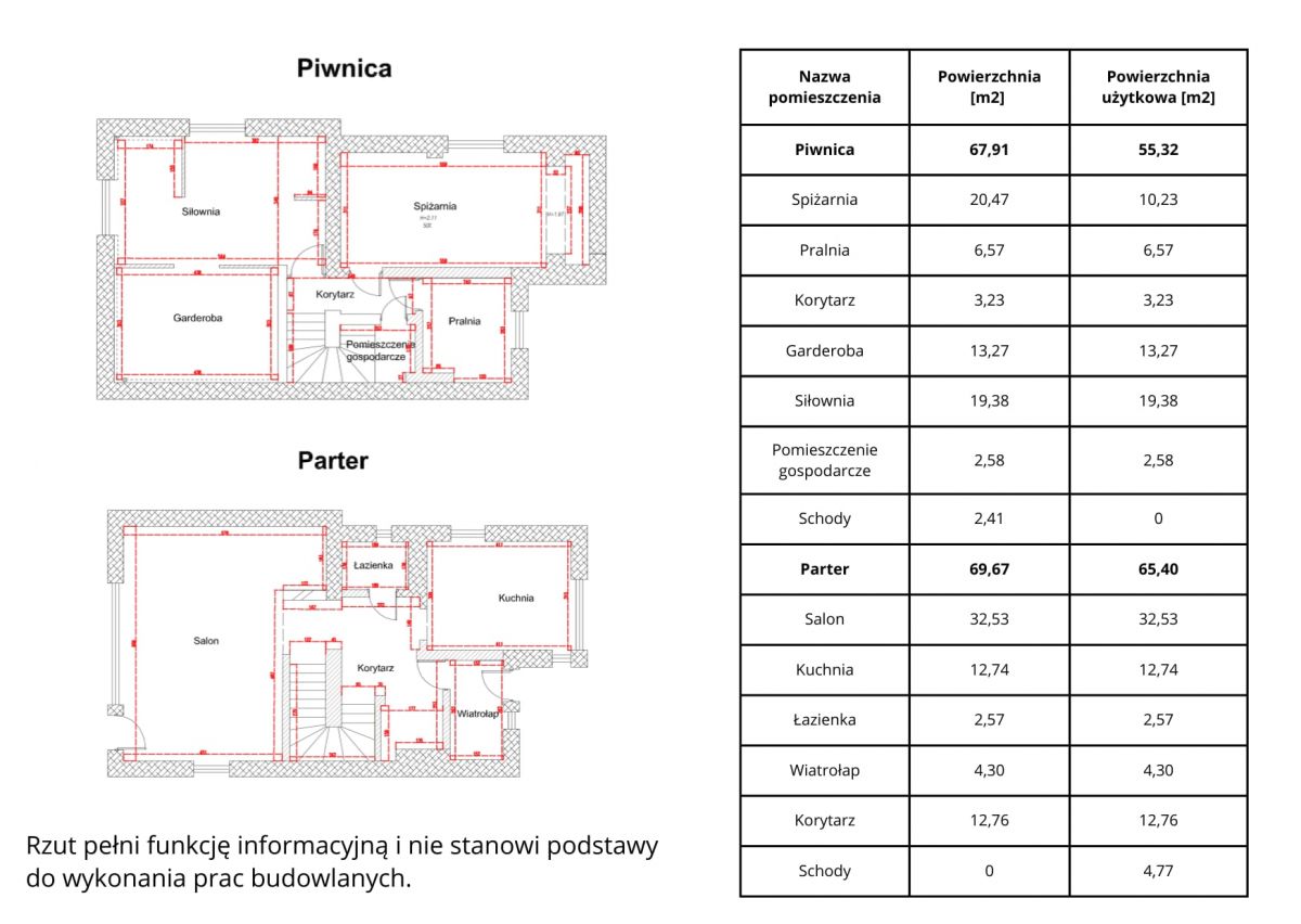 - Piwnica - 55,32 m2, parter - 65,40 m2, piętro - 46,58 m2, poddasze - 8,15 m2 pow. użytkowej