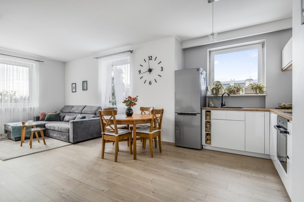- kuchnia - w aneksie, dobrze zaprojektowana, stanowiąca dopełnienie salonu pod względem stylu i kolorystyki. Duża ilością szafek i szuflad do przechowywania oraz szerokie blaty robocze zapewniają funkcjonalność i komfort podczas przygotowywania posiłków. Kuchnia została wyposażona w niezbędne sprzęty AGD, w tym lodówkę z zamrażalką, płytę indukcyjną, piekarnik i zlewozmywak.