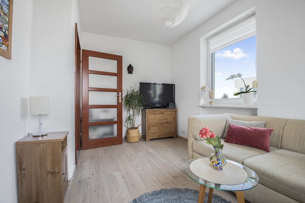 - salon (22 m2 wraz z 6,68 m2 aneksem) -przestronny a jednocześnie przytulny, utrzymany w jasnej, stonowanej kolorystyce. W salonie znajduje się rozkładany trzyosobowy narożnik, wygodny fotel i podwieszany telewizor. Stojący obok sporej wielkości stół z czterema krzesłami z powodzeniem pomieści wszystkich członków rodziny przy wspólnym posiłku lub podczas wieczornych rozmów czy gier planszowych.
