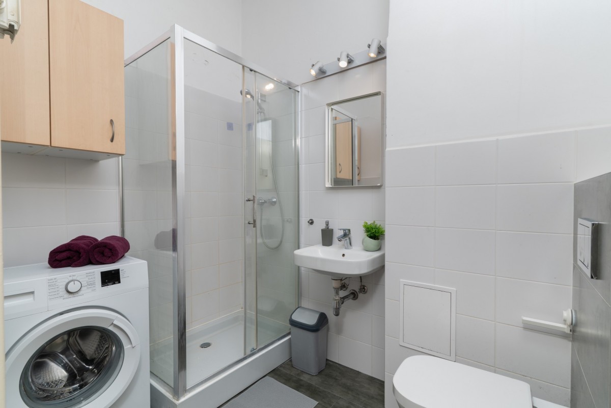- łazienka z kabiną prysznicową i WC,