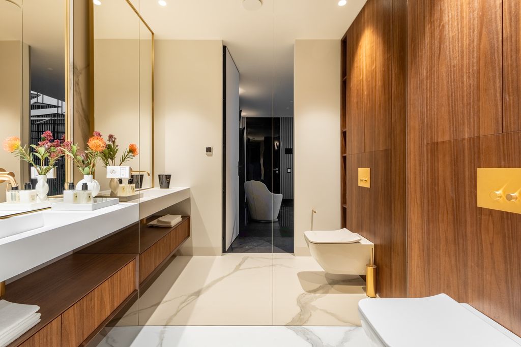Wnętrza wykończono materiałami najwyższej jakości: naturalne drewno, kamień, panoramiczne okna o podwyższonych parametrach akustycznych i termicznych. Kuchnia wyposażona w sprzęt najlepszych światowych marek. Jasne i przestronne pomieszczenia zachwycają elegancją i funkcjonalnością.