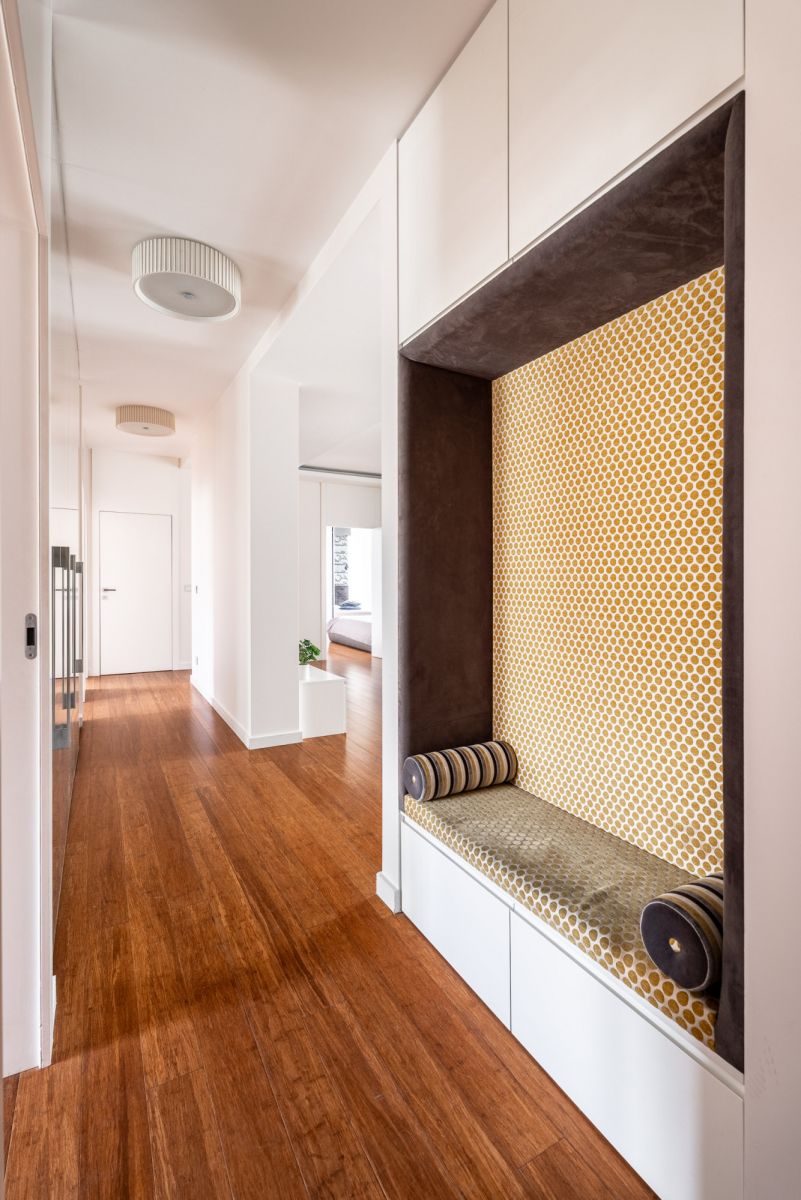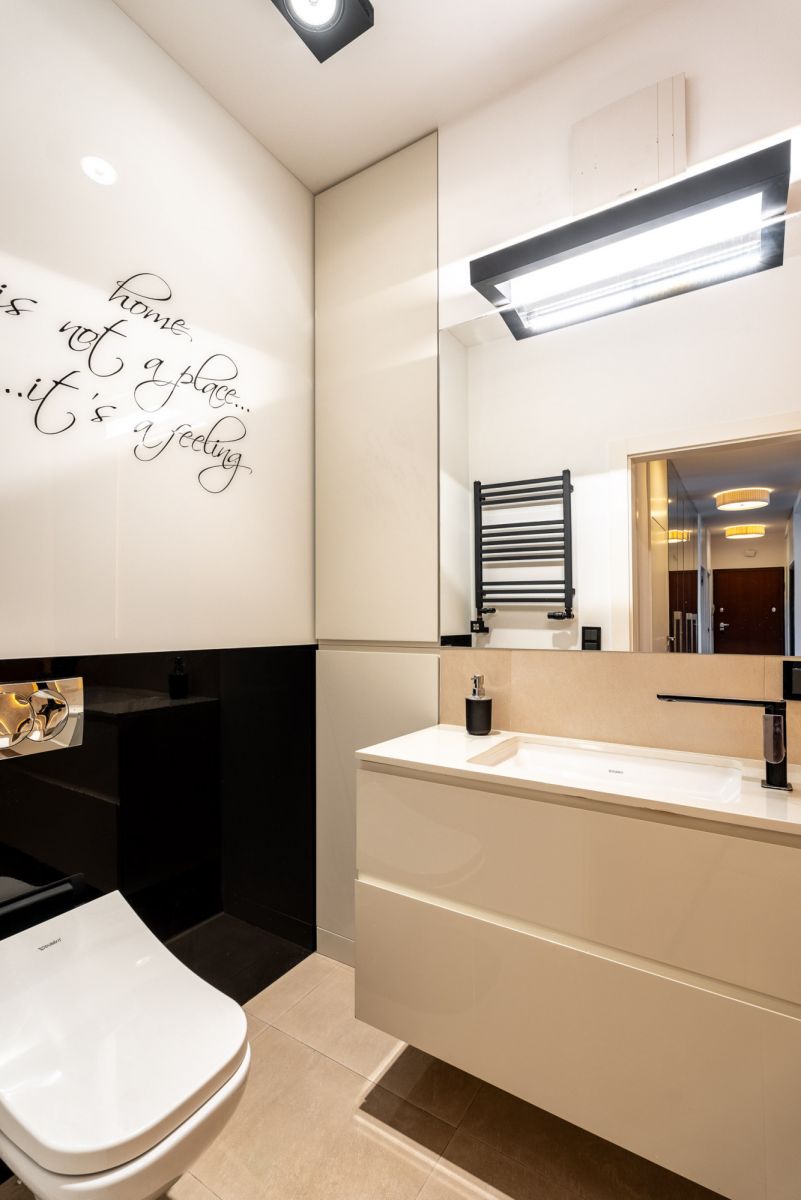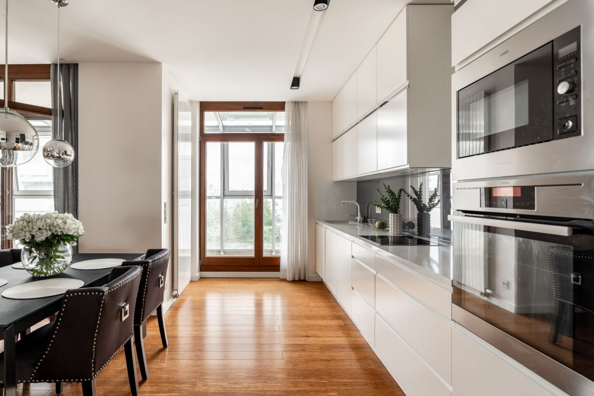 Apartament wykończony w wysokim standardzie, z dbałością o każdy detal. Zastosowano materiały najwyższej jakości — na podłogach znajduje się naturalne drewno, a w łazienkach elegancka ceramika i armatura renomowanych producentów.