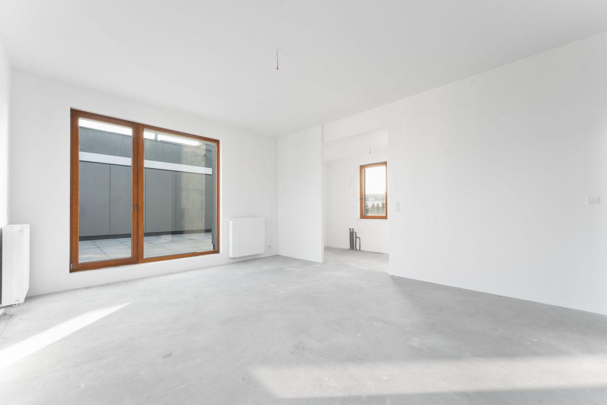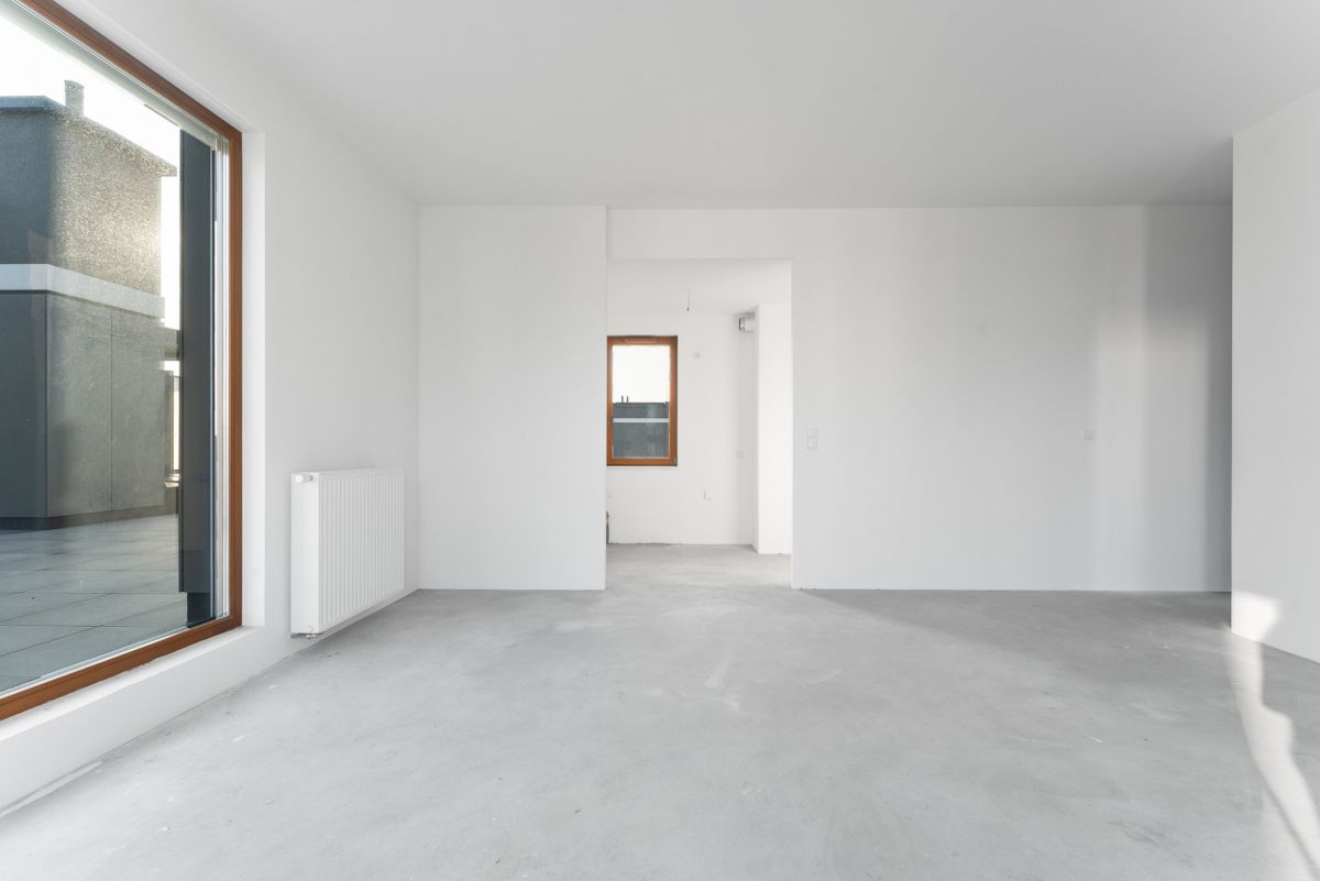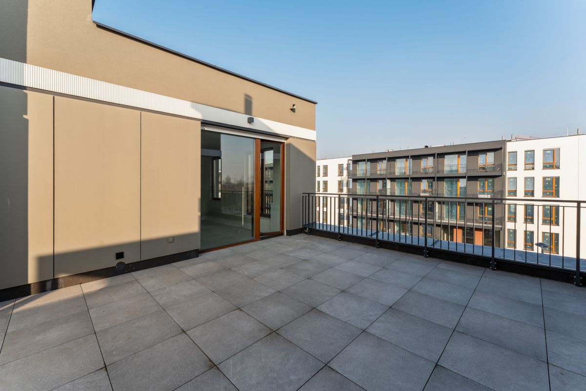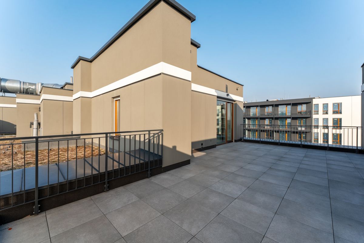 This spacious penthouse, featuring 3.2 m high ceilings, consists of five well-proportioned rooms, an open-plan kitchen connected to the living room, a pantry, two bathrooms, a toilet, a walk-in closet, and a laundry room. With exposure to three cardinal directions and its location on the third and top floor, the interior is bright and well-lit. A key advantage of this apartment is the vast 45 m² terrace.