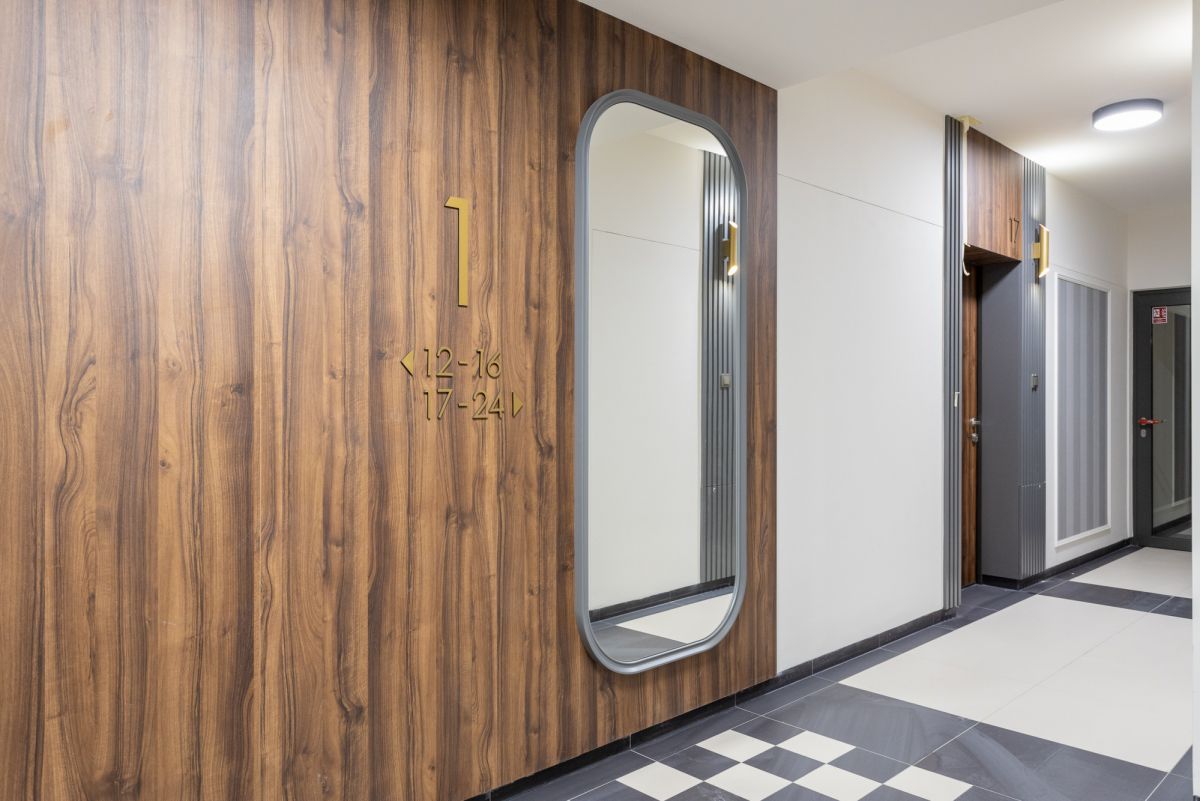 Wchodząc do holu głównego inwestycji witają nas drzwi otwierane bezdotykowo i portiernia z całodobową ochroną. Chodniki wykonane zostały z kostki antysmogowej dodają elegancji częściom wspólnym.