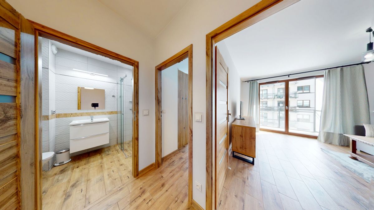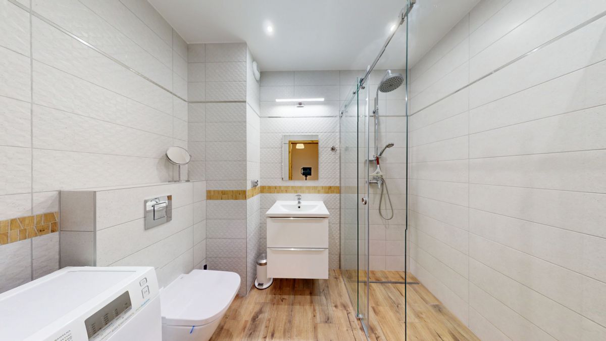 - Łazienka z kabiną prysznicową typu walk-in i pralką