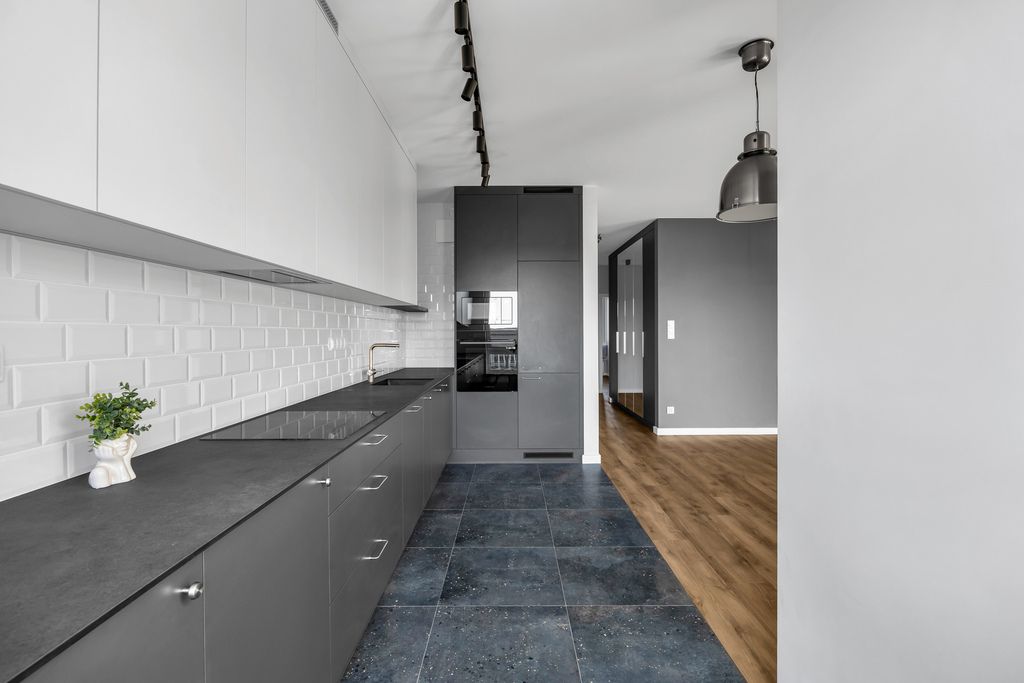 - całkowicie wyposażonego aneksu kuchennego: lodówka, zmywarka, płyta indukcyjna, piekarnik elektryczny, kuchenka mikrofalowa, okap;
